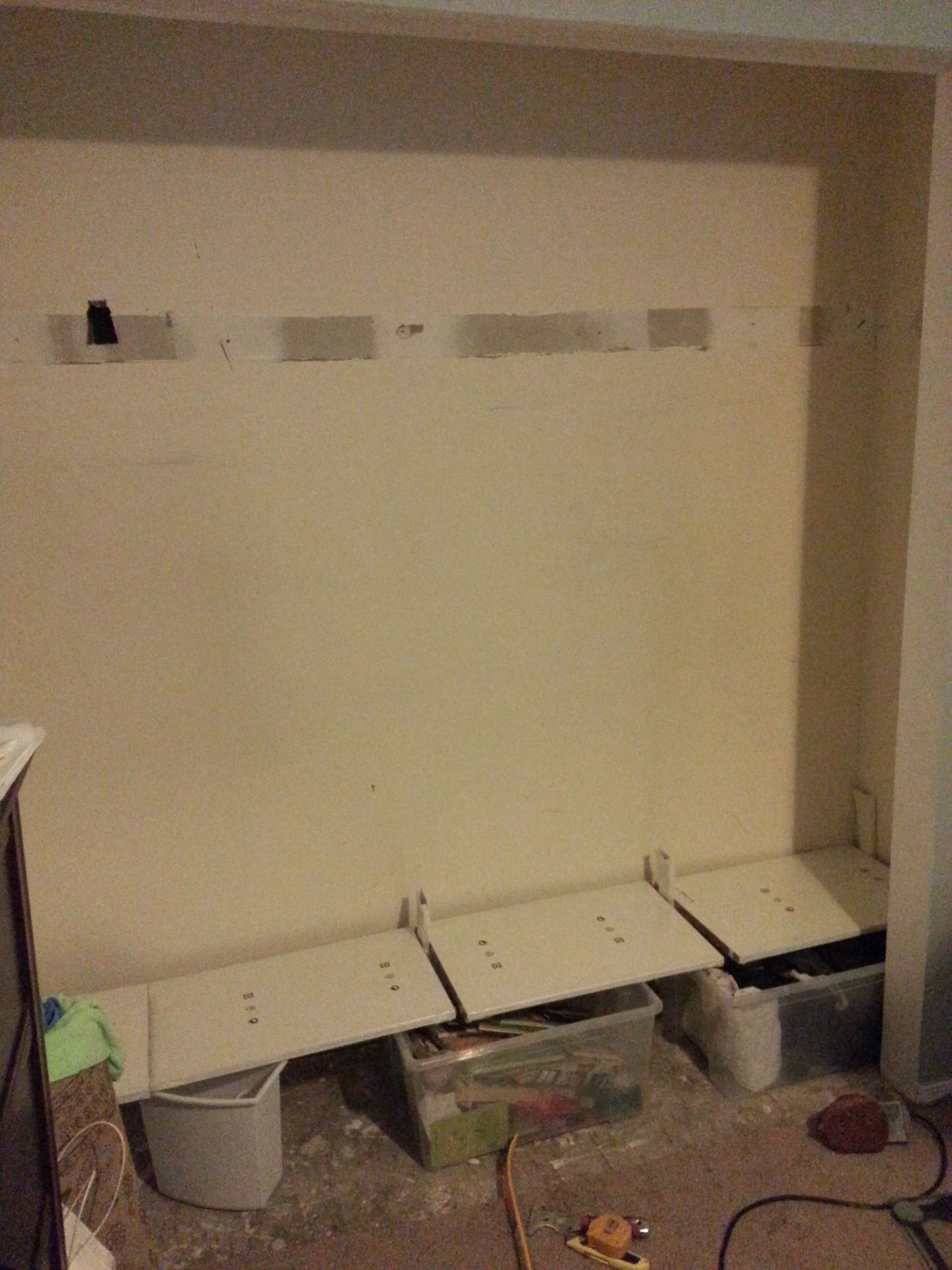 My wife wanted to do our master closet by herself. The sheetrock couldn't take the Home Depot closet system seen in the 1st picture due to the configuration we wanted mismatching with the beam spacing, so the best approach is to drill plywood into the beams, allowing the closet system be installed in any configuration.